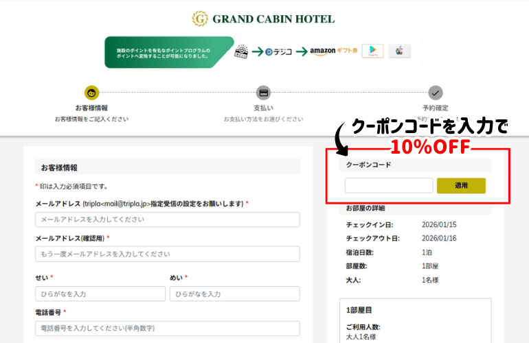 公式HPご予約ページのお客様情報入力画面にてクーポンコードを入力!